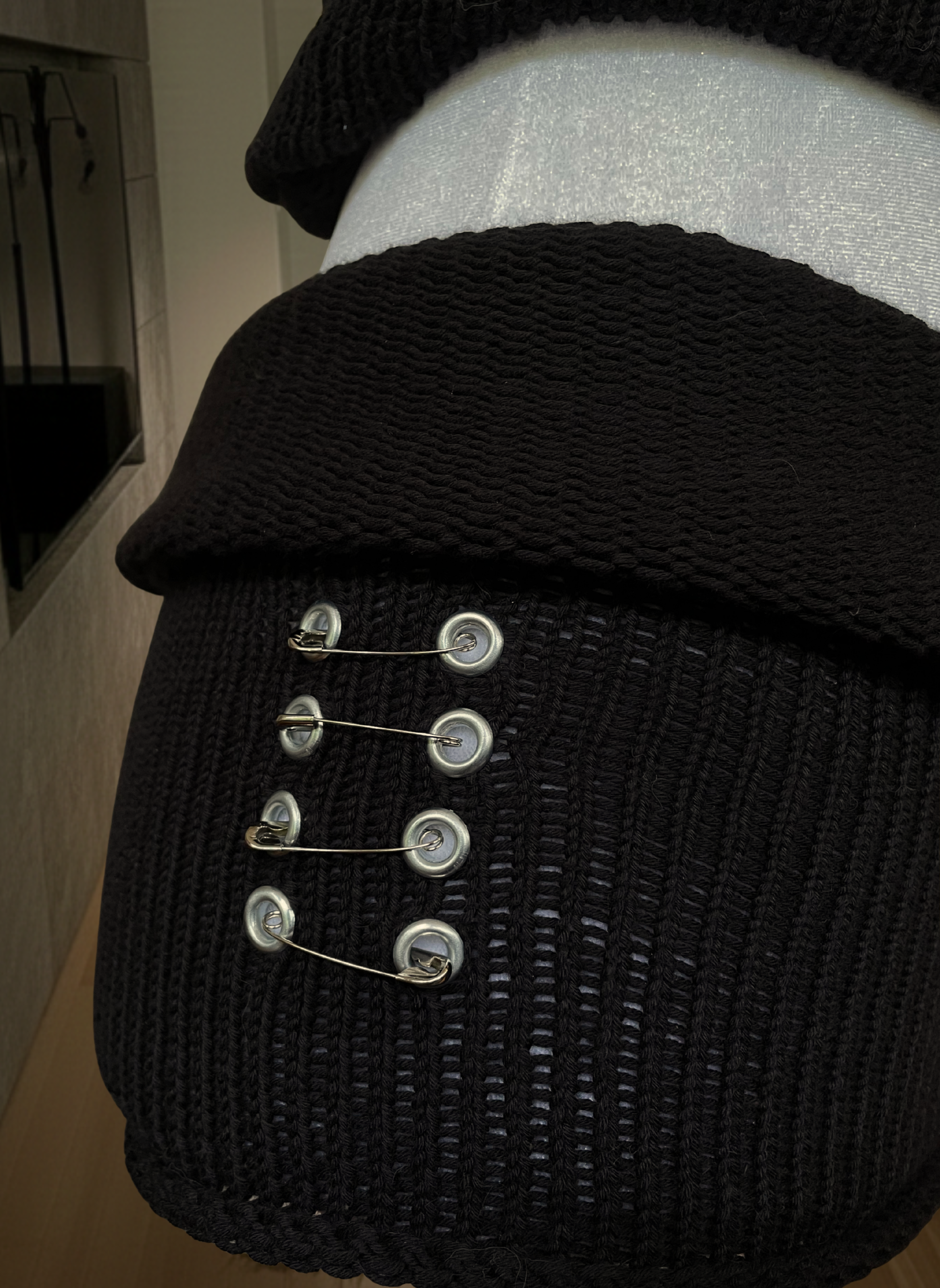 - The foldover skirt is detailed with grommets and safety pins on both sides