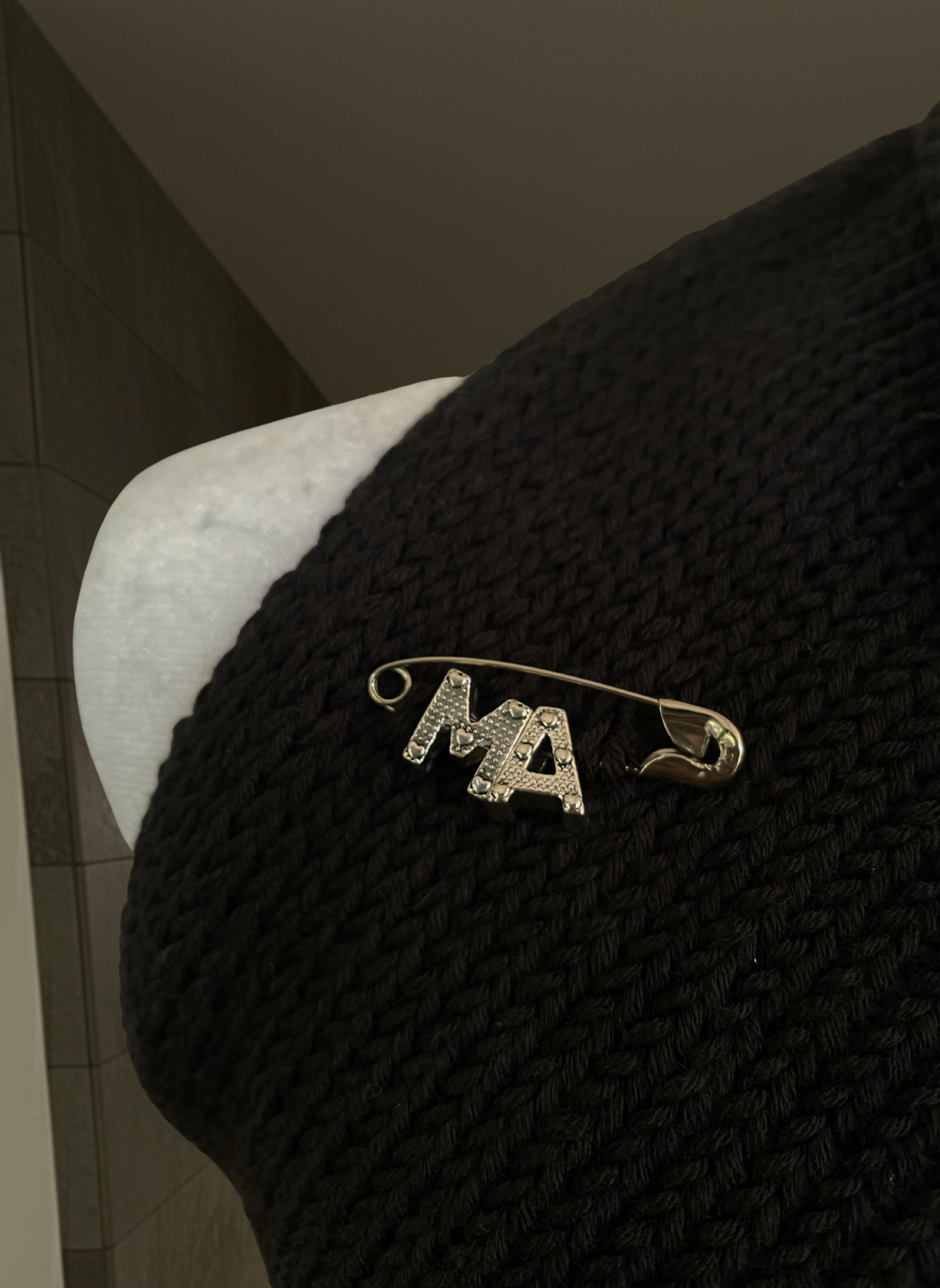 - The halter top features a low-back silhouette with a safety pin closure accent